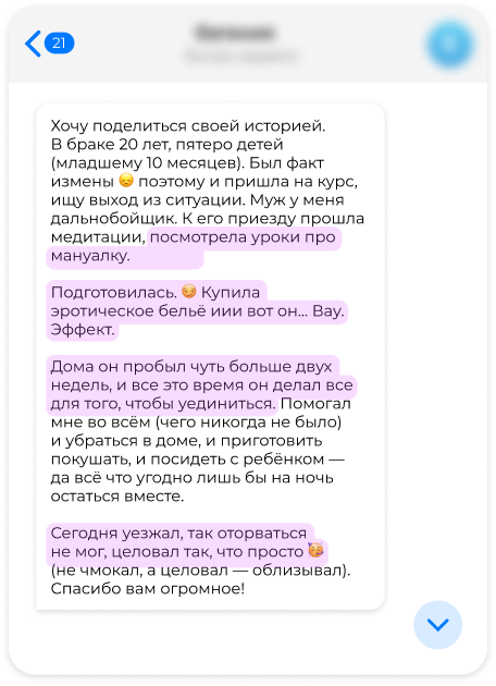 Хочу поделиться своей историей. В браке 20 лет, пятеро детей (младшему 10 месяцев). Был факт измены 😞 поэтому и пришла на курс, ищу выход из ситуации. Муж у меня дальнобойщик. К его приезду прошла медитации, посмотрела уроки про мануалку.